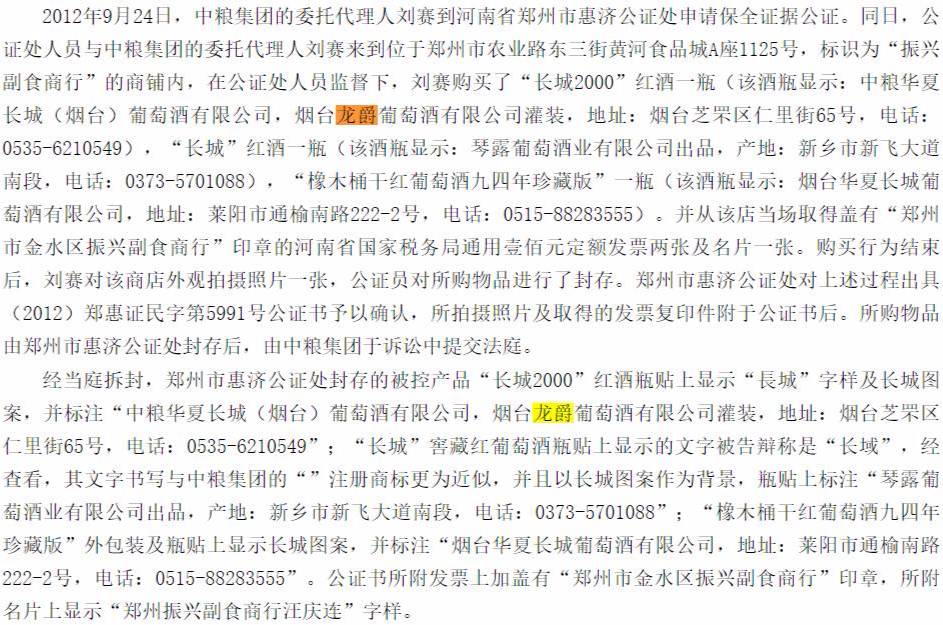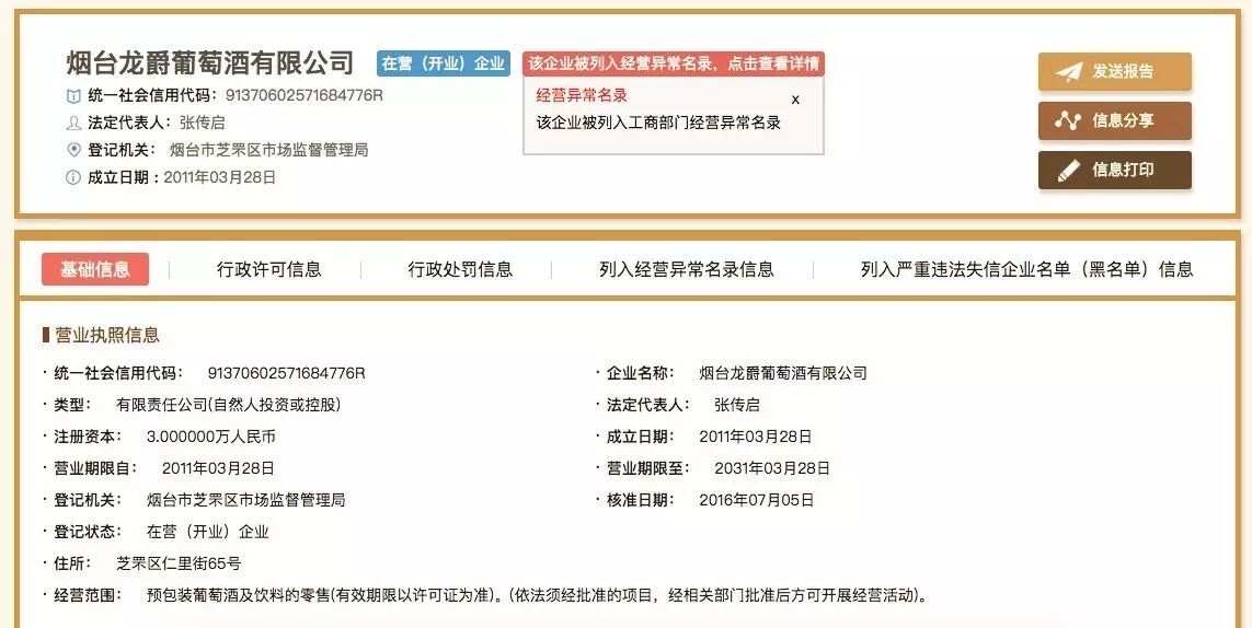 而这个烟台龙爵葡萄酒有限公司,我们在国家企业信用信息公示系统中,查到了以下信息,其实该企业已被列入经营异常名录。并且,该企业在2013年就参与类似仿冒事件,在中国知识产权判决文书网站已公示,中粮酒业胜诉。