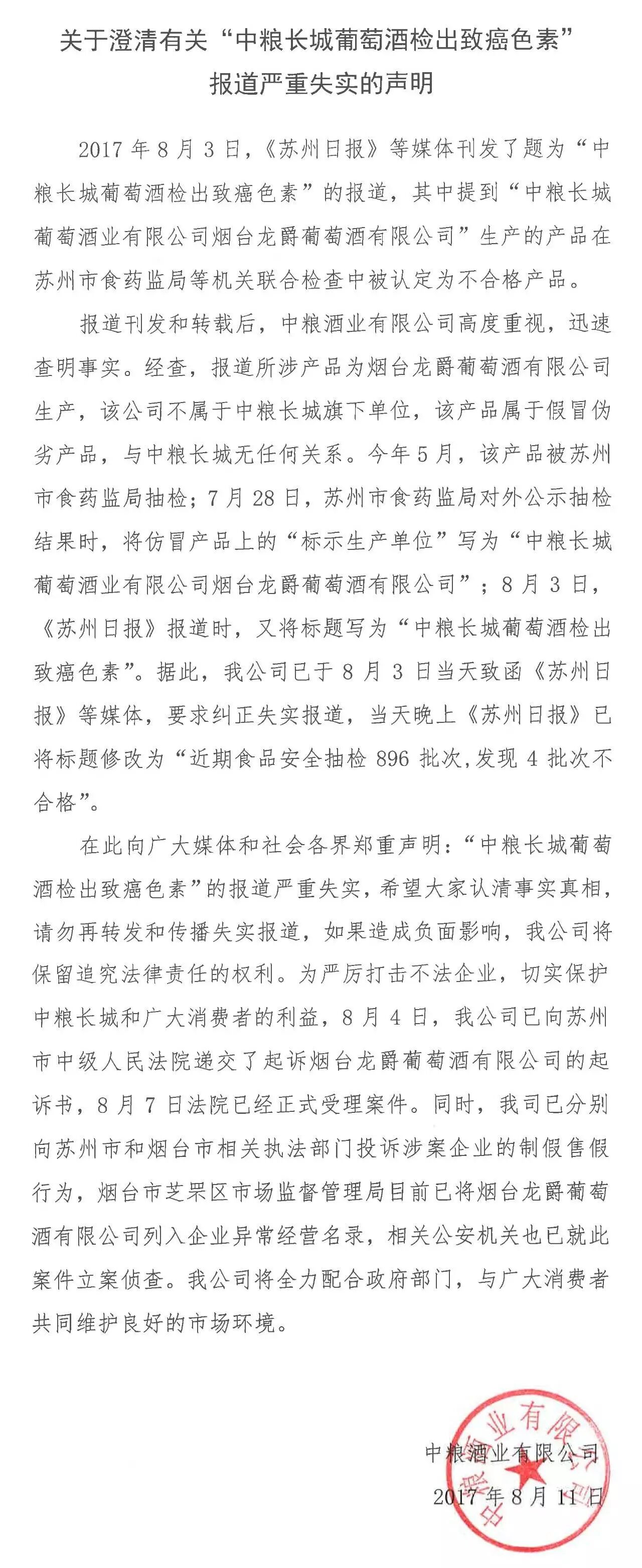 这篇声明的大意是:“中粮酒业和事件中的 ‘中粮长城葡萄酒有限公司 烟台龙爵葡萄酒有限公司’ 没有任何关系,而且已经就此事对它提起诉讼;苏州日报也已经认识到错误,对标题做出整改。”